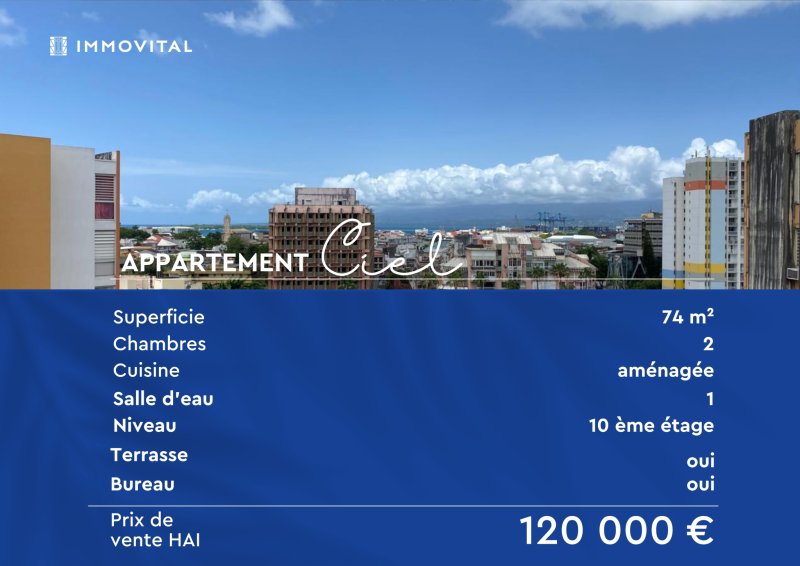 IMMOVITAL vous propose à la vente ce bel appartement de type T4, situé au 10e étage de la Tour FERDIN CUIRRASSIER, à l'entrée du centre-ville de Pointe-à-Pitre, en Guadeloupe. Un bien rare, bénéficiant d'un emplacement central et accessible par ascenseur. L'appartement, vendu entièrement meublé, se compose de : Un séjour lumineux et accueillant Une cuisine aménagée et équipée, prête à l'emploi Deux chambres climatisées avec placards intégrés Un grand bureau climatisé, idéal comme espace de travail ou de télétravail Une salle d'eau complète + un WC indépendant Des rangements optimisés dans les couloirs Une terrasse avec vue dégagée sur les environs et un aperçu mer Ce bien offre de nombreux atouts : un environnement agréable, des prestations fonctionnelles et une situation idéale à proximité immédiate des commerces, écoles, transports et services.