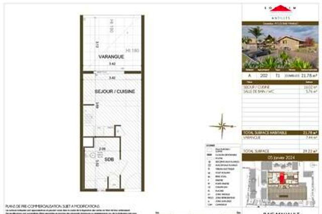 Nous vous proposons un appartement T1,1 pièce au 2ème étage de 21,82m² de superficie habitable plus une varangue de 7,44m² soit une superficie totale de 29,26m², offrant des prestations de standing, volets roulants motorisés, eau chaude solaire individuelle, salle d'eau moderne, placards aménagés (selon les plans) portes palières 3 points, vidéophone, ascenseur...