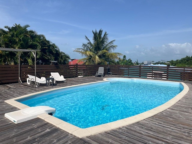SAINTE ROSE - SECTION DUZER Très jolie maison récente de 2014, d'environ 170 m2 composée d'un grand séjour avec cuisine ouverte donnant sur un cellier. Belle terrasse d'environ 40 m2 Très jolie maison récente (2014) située à Sainte-Rose, Section Duzer. Environ 170 m2 habitables. Grand séjour lumineux avec cuisine ouverte. Cellier attenant à la cuisine. Belle terrasse d'environ 40 m2 avec vue mer et montagne. 3 chambres, 3 salles d'eau, 3 WC. Piscine avec terrasse en deck. Terrain non clôturé de 2 500 m2. Terrain partiellement constructible. Deux bungalows 35m2 indépendants construit en 2019. Premier bungalow : séjour, cuisine indépendante, salle d'eau avec WC, terrasse. Deuxième bungalow : séjour avec kitchenette, une chambre, salle d'eau avec WC, terrasse. Cadre calme et verdoyant. Idéal pour investissement locatif ou projet familial. À découvrir rapidement !