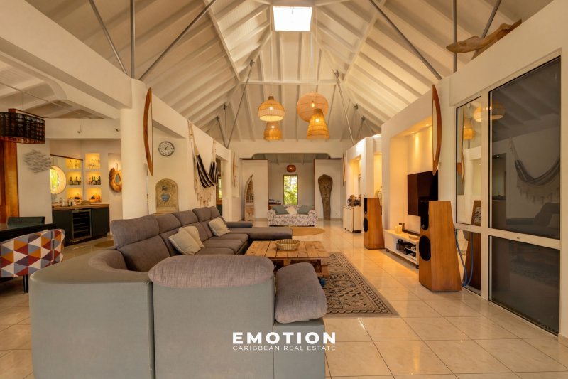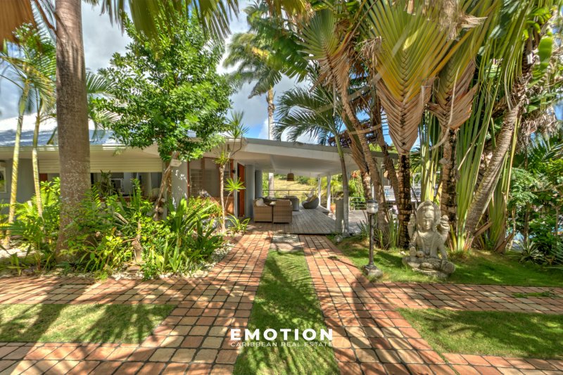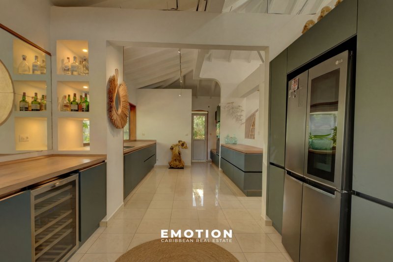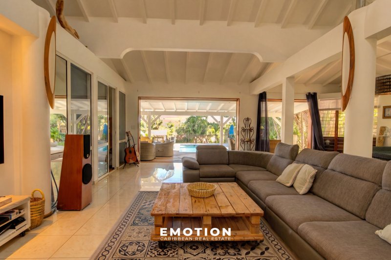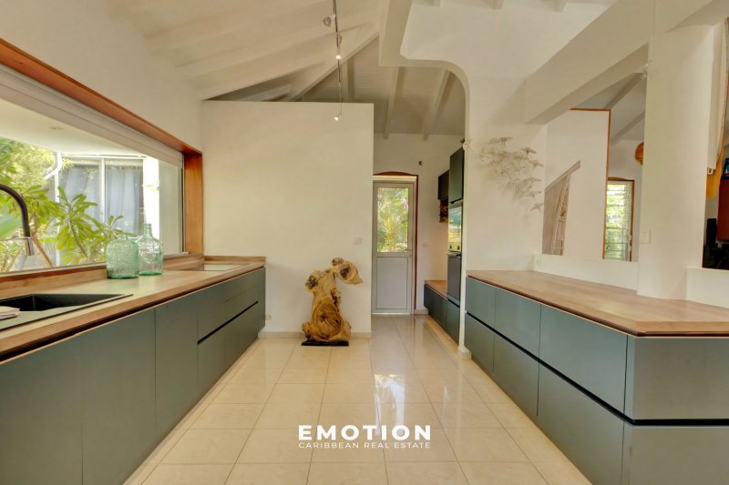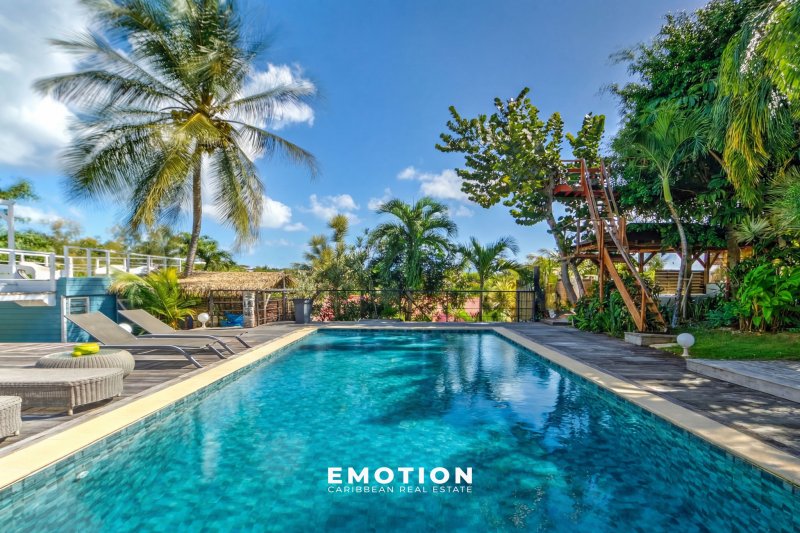 Maison de prestige surface à préciser + surface à préciser de terrasses couvertes Secteur du Héleux - Nouveau mandat exclusif Le cabinet Emotion vous propose à la vente, à l'abri des risques de submersion, dans un environnement calme et sécurisé par un portail, une maison de prestige nichée au coeur d'un jardin tropical, sur le secteur prisé du Helleux, à seulement cinq minutes à pied de la plage et du spot de surf du Helleux, à proximité immédiate de Saint-François et à dix minutes du bourg de Sainte-Anne. Le bien se compose : d'un vaste séjour lumineux de 110 m2, sublimé par une impressionnante hauteur sous plafond de 6,50 mètres, d'une cuisine contemporaine, entièrement équipée et réalisée il y a moins de trois ans, de deux chambres accueillantes et de deux salles d'eau. Ce niveau est prolongé par une grande terrasse couverte offrant une vue dégagée sur l'espace piscine et son jardin tropicale. Au niveau inférieur, le bien se compose : de deux appartements deux pièces indépendants, entièrement meublés, comprenant chacun une chambre, une cuisine équipée et une terrasse privative. Idéal pour de la location saisonnière ou pour accueillir famille et amis en toute autonomie. Un troisième logement, de type trois pièces indépendant et situé à l'extérieur de la maison, complète l'ensemble avec deux chambres, une cuisine équipée et une belle terrasse. Le bien se compose en annexes: une piscine au sel de belles dimensions, un espace jacuzzi, une salle de sport, un espace détente de 'ti punch-bar', ainsi qu'un jardin tropical luxuriant aménagé avec goût. La propriété, parfaitement intégrée dans son environnement naturel, invite à la sérénité et au partage, entre ombrages, circulation fluide et respiration végétale. Informations complémentaires:Il ne nécessite aucun travaux. Prix HAI : 980 000 EUR