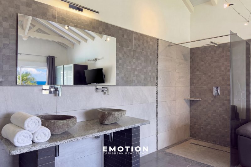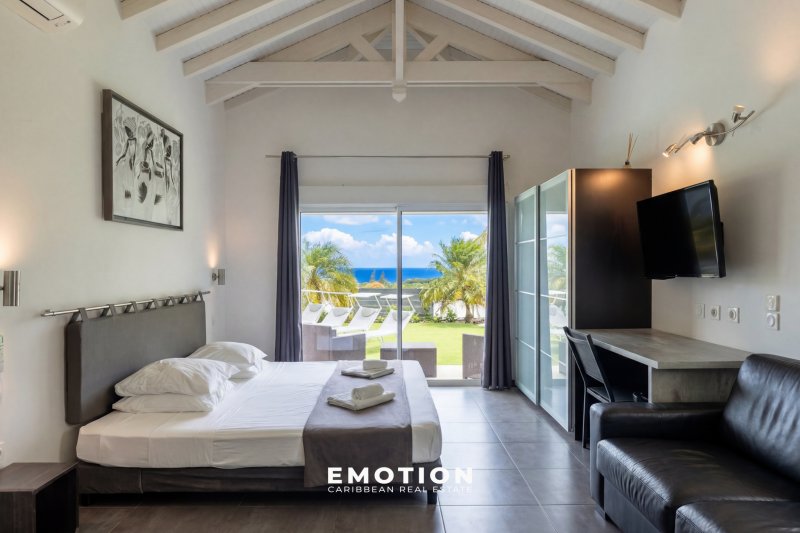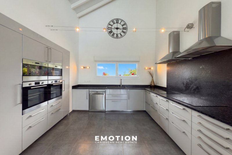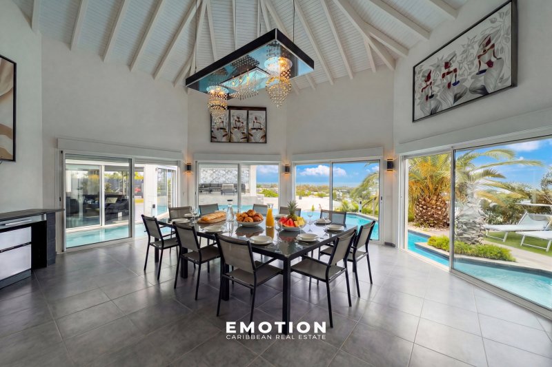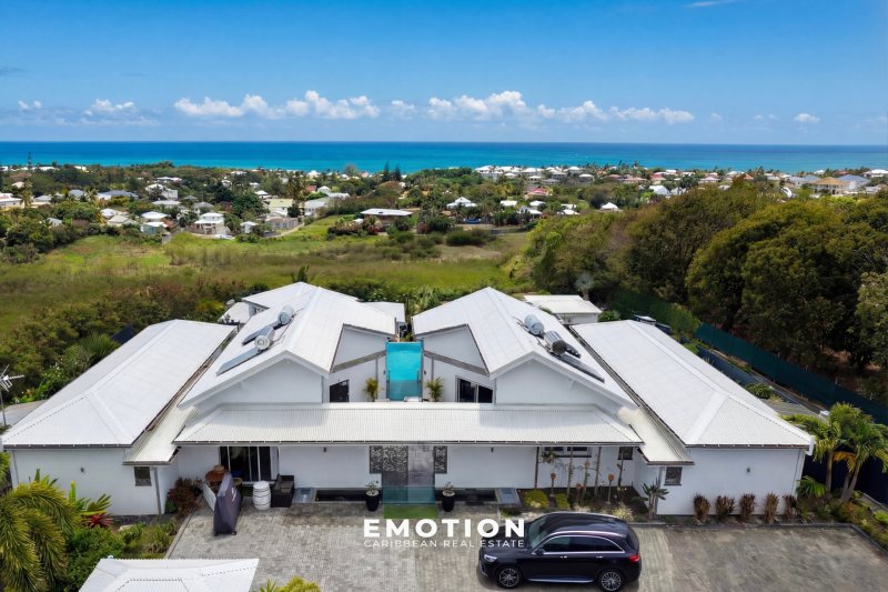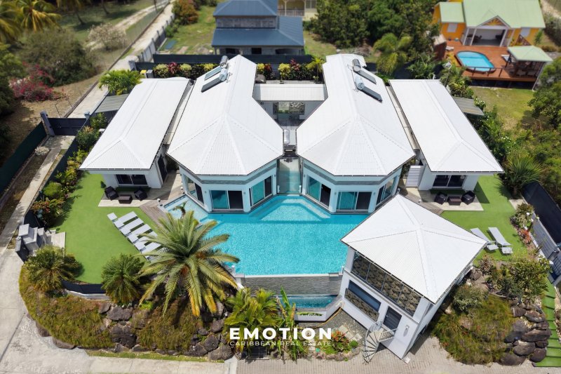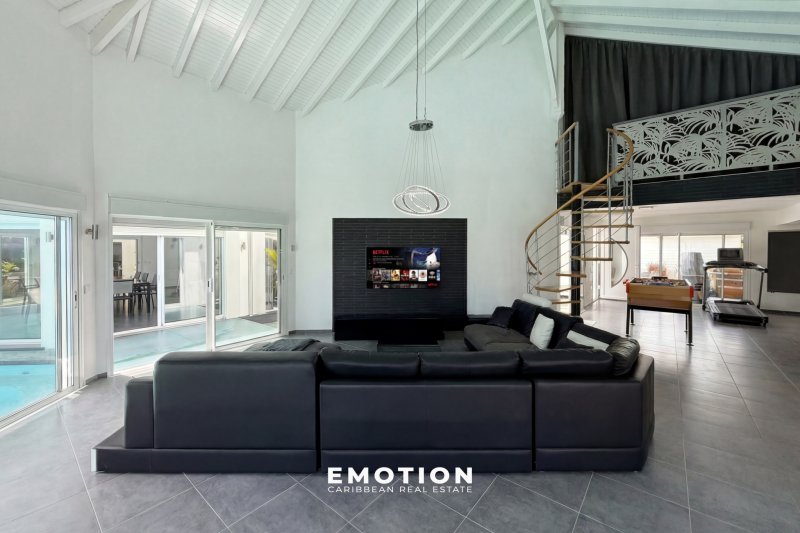 Villa 300 m2 - 5 CH + mezzanine Vue mer 180o Saint-François, Guadeloupe Le cabinet Emotion Guadeloupe vous propose à la vente, sur le secteur recherché de Saint-François, une villa d'architecte contemporaine offrant une vue mer panoramique à 180o, dans un environnement calme et privilégié à seulement quelques minutes des plages, du golf et de la marina. Construite en 2021 et bénéficiant encore de la garantie décennale, cette propriété séduit par la qualité de sa construction en béton banché, ses volumes et sa conception ouverte tournée vers l'extérieur et la mer. Les hauteurs sous plafond, atteignant jusqu'à 7 mètres dans les espaces de vie, ainsi que les nombreuses ouvertures, offrent une luminosité remarquable tout au long de la journée. La propriété se compose d'une entrée sur un patio central avec jacuzzi, véritable pièce maîtresse de la villa, agrémenté de bassins de carpes japonaises et prolongé par un élégant jeu de circulation d'eau reliant les différents espaces jusqu'à la piscine. Un passage avec pont et marches en verre vient structurer l'architecture et relier harmonieusement les deux ailes de la propriété. Les volumes de vie se distinguent par leur fluidité et leur ouverture. L'espace salon, d'environ 72 m2, accueille un salon ainsi qu'une salle de sport d'environ 27 m2, créant un lieu de vie confortable et modulable. Dans son prolongement, la partie salle à manger avec cuisine ouverte développe environ 62 m2, dont 20 m2 de cuisine aménagée et équipée, complétée par un cellier / buanderie attenant. La villa propose cinq suites ainsi qu'une chambre en mezzanine, offrant une configuration idéale pour une résidence principale ou un projet locatif. Quatre suites de plain-pied, comprises entre 27 m2 et 30 m2, disposent chacune de leur salle d'eau avec douche à l'italienne et double vasque. Une cinquième suite indépendante en rez-de-jardin d'environ 22 m2 permet de recevoir en toute intimité, tandis que la mezzanine d'environ 13 m2 vient compléter les espaces nuit. À l'extérieur, la propriété s'organise autour d'une piscine à débordement de 92 m2 (15 x 5 m) avec traitement au sel, accompagnée de larges terrasses d'environ 80 m2, ainsi que d'un vaste carbet aménagé en espace lounge extérieur avec vue mer panoramique. Le jardin paysager, arboré et entretenu, s'intègre parfaitement à l'ensemble et renforce le caractère intimiste des lieux. Trois douches extérieures viennent compléter les aménagements. Pensée pour le confort et l'autonomie, la villa dispose de quatre chauffe-eaux solaires pour une capacité de 800 litres, d'un système de récupération avec trois cuves de 1 300 litres, ainsi que d'un assainissement indépendant par mini-station d'épuration conforme. La propriété est entièrement clôturée et sécurisée avec portail motorisé et visiophone, et bénéficie de stationnements intérieurs. Dans une logique d'investissement, il est également possible de faire l'acquisition de deux villas supplémentaires situées sur la parcelle avoisinante, offrant ainsi un ensemble immobilier rare sur le secteur. Un dossier complet incluant historique, chiffres d'exploitation, rentabilité et coûts d'entretien est disponible sur demande. Année de construction : 2021 Surface habitable : 299 m2 Terrain : environ 1 000 m2 Terrasses : environ 80 m2 Piscine : 92 m2 au sel DPE B : 19,67 Sous garantie décennale Aucun travaux à prévoir PZR 2021 : zone blanche Prix frais d'agence inclus : 2 320 000 EUR (honoraires charge vendeur) Taxe foncière : 6 000 EUR Pour plus d'informations ou pour organiser une visite, contactez-nous dès maintenant par téléphone ou WhatsApp au +590 690 66 35 40 ainsi que le +33 6 73 39 15 48 Retrouvez également toutes nos exclusivités sur Instagram @sxmrealestatelistings ainsi que @florence.emotion.realestate
