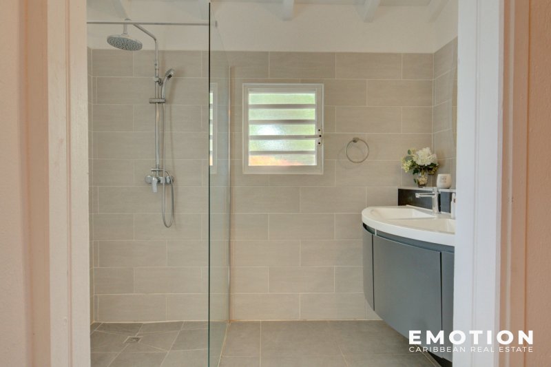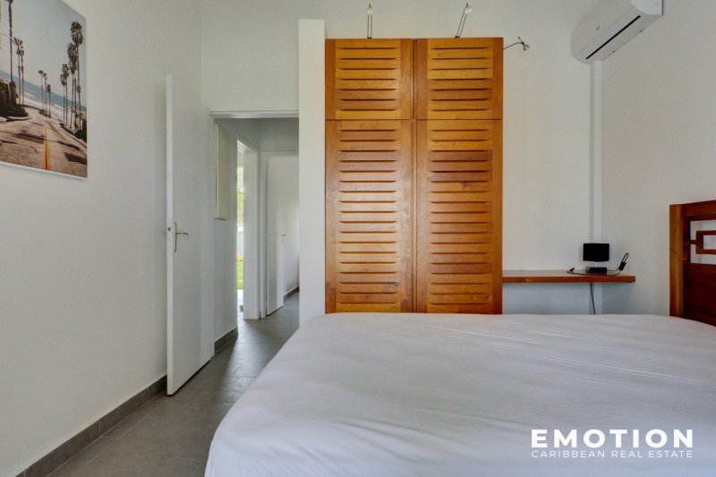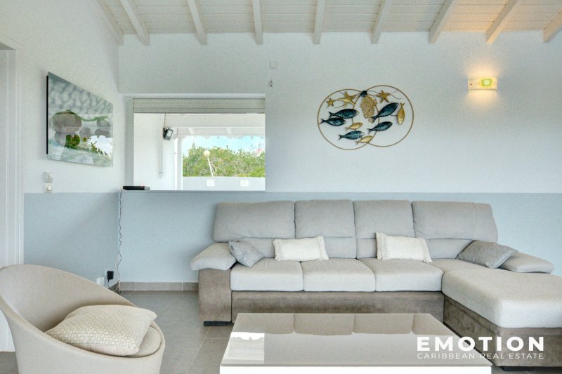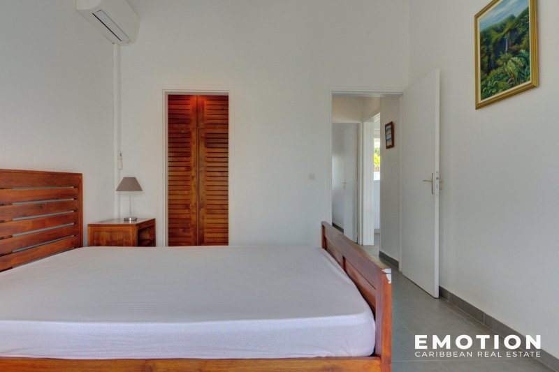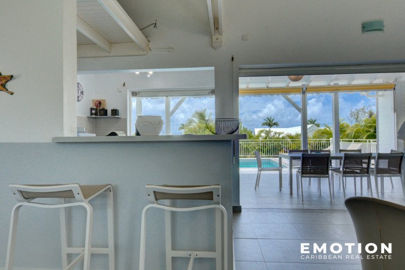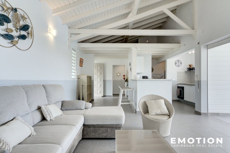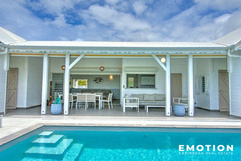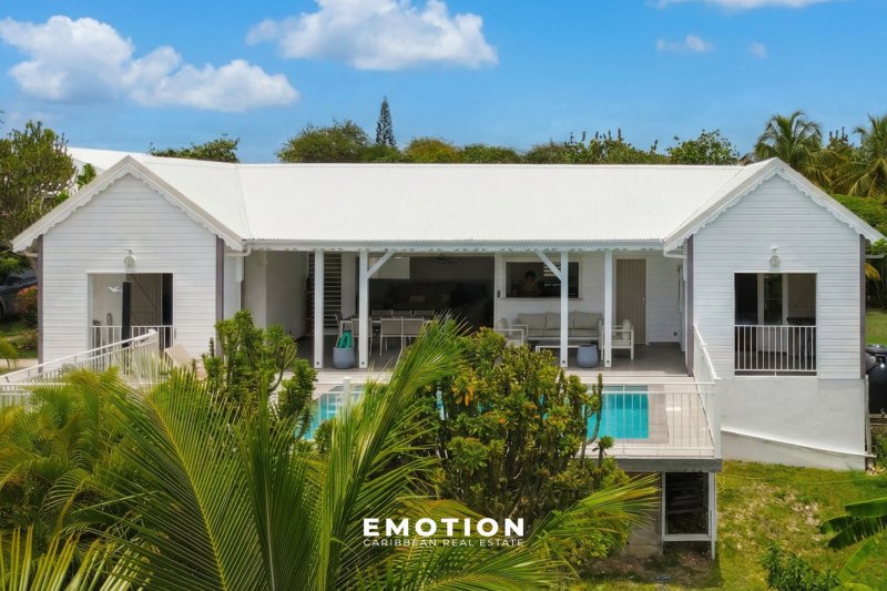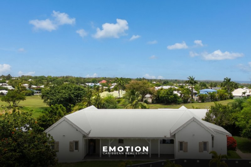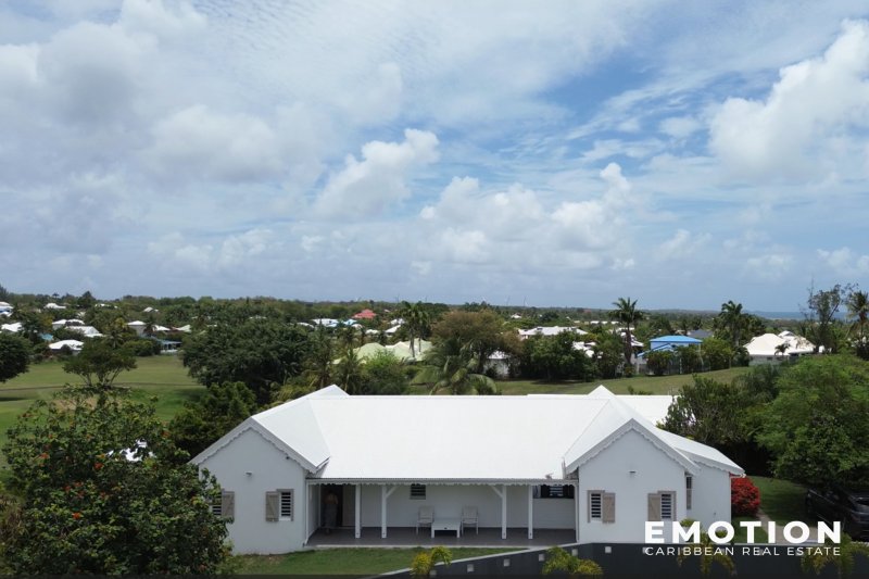 Villa T5 - 2e Rang Golf à Saint-François ( Guadeloupe) NOUVEAUTE Le cabinet EMOTION Real Estate Guadeloupe, vous propose un nouveau bien à la vente sur la commune de Saint-françois appréciée en particulier pour son lagon, son aérodrome et son Golf international. La villa se situe sur les hauteurs dans un secteur calme et recherché en 2e rang Golf sur une parcelle clôturée et arborée de 825 m2. La Villa de 110 m2 se compose de: un salon traversant et ventilé possédant une très belle hauteur sous plafond, une cuisine ouverte sur le salon et la terrasse entièrement équipée, un cellier attenant, 2 suites climatisées avec leur propre salle de bain, dressing ou placard, 2 chambres climatisées avec placard, 1 salle de bain avec douche à l'italienne. Le salon, la cuisine et 2 chambres s'ouvrent sur la piscine et la terrasse ombragée. C'est une villa d'architecte béton de plain pied très bien conçue avec les 2 espaces nuits distincts pour plus d'intimité séparés par le séjour. Le bien est vendu entièrement meublé, prête à accueillir les amateurs de golf, pour y vivre ou pour investir car elle possède un fort potentiel locatif . Le bien se compose en annexe : - une citerne d'eau - 2 places de stationnement aérien - une piscine au sel - portail électrique - vide sanitaire avec rangement - DPE B - PPRN 2019 : Zone Blanche - Prix : 690 000 EUR HAI, honoraires à la charge du vendeur Pour plus d'informations , contactez moi par téléphone ou Whatsapp Florence Caruso +33 6 73 39 15 48