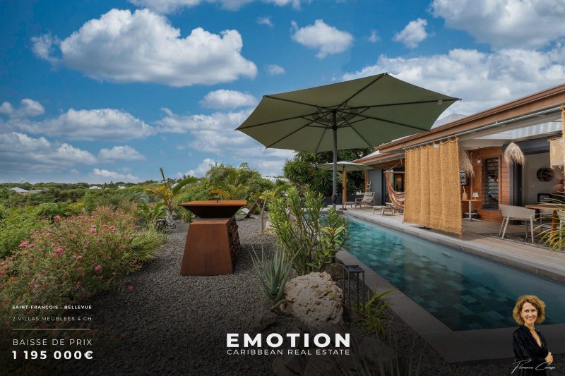 Villa et Gite 4 chambres entièrement meublées à Saint-François ( Guadeloupe) BAISSE DE PRIX Le cabinet EMOTION Real Estate Guadeloupe, vous propose un nouveau bien à la vente sur la commune de Saint-françois appréciée en particulier pour son lagon, son aérodrome et son Golf international. Il se situe à 500 m de la mer près de la route touristique, dans un magnifique jardin tropical clôturé de 1 500 m2 comprenant plus de 300 essences. L'ensemble composé de 2 Villas avec entrées indépendantes bénéficie d'une petite vue mer dégagée. La Villa principale de 111 m2, idéale comme résidence principale, se compose de: un salon lumineux de 46 m2 avec une très belle hauteur sous plafond et sa cuisine entièrement équipée, 2 suites de 33 m2 et 24 m2 climatisées avec chacune salle de bain, douche à l'italienne et dressing. Le salon et les chambres s'ouvrent sur la piscine et la terrasse ombragée de 66 m2 dotée de deux pergolas bioclimatiques. La Villa secondaire de 56 m2, actuellement exploitée en location touristique, se compose de : un salon de 21 m2 avec cuisine ouverte entièrement équipée, 2 suites climatisées de 18 m2 et 16 m2 chacune avec rangements et salle de bain avec douche à l'italienne. Le salon et les chambres s'ouvrent sur la terrasse ombragée de 40 m2 et une piscine type 'bac à punch'. Pour le plaisir des vacanciers , un terrain de pétanque a été aménagé. Les finitions sont parfaites et la décoration a été réalisée avec beacoup de goût en mélangeant confort moderne et authenticité. Un jolie invitation à la détente et à la révêrie C'est un bien idéal pour y habiter tout en bénéficiant d'un complément locatif mais également pour un investisseur qui recherche une très belle rentabilité financière . La 2e villa a généré un chiffre d'affaires annuel de plus de 40 000 EUR dès sa 1ere année de mise en location avec une note de 9.8/10. Les 2 villas ont été construites en 2023 et bénéficient des garanties décennales. Le bien se compose en annexe : - un bungalow de 18 m2 abritant 3 citernes d'eau pour un total de 2 250 litres , une plonge professionnelle, un frigo à boissons, un congélateur ainsi que divers outils et matériel de jardinage. - 5 places de stationnement aérien - une piscine de 9 m x 2,5 m - une piscine type 'bac à punch' de 2,75 m x 2,75 m. - PPRN 2019 : Zone Blanche - DPE A - Prix : 1 195 000 EUR HAI, les honoraires sont à la charge du vendeur Pour plus d'informations , contactez moi par téléphone ou Whatsapp Florence Caruso +33 6 73 39 15 48