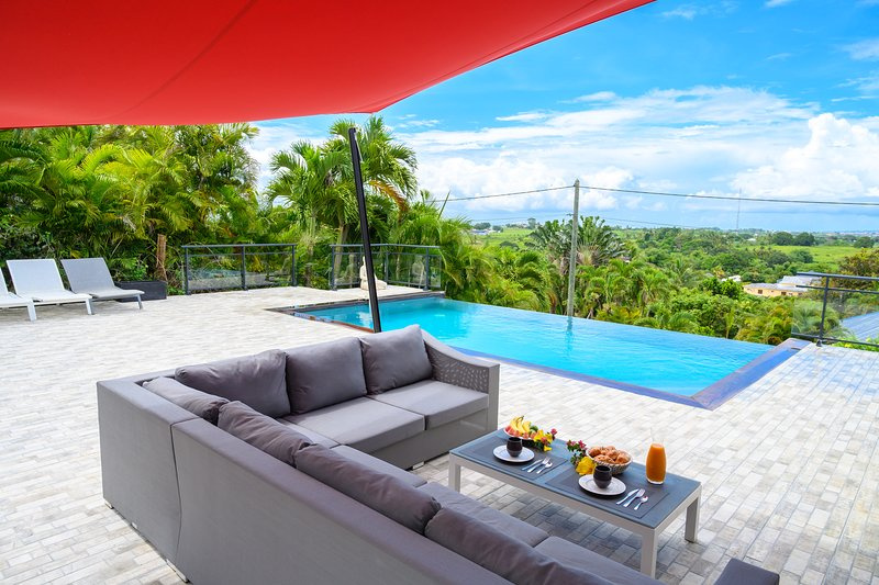Ce bien atypique situé à Moudong Sud, avec sa petite vue mer depuis la villa, sera vous séduire par son emplacement et sa rentabilité locative de 3.400EUR/mois (hors charges) ! Il est composé de : o VILLA T4 de 158 m2 avec petite vue mer et sa grande terrasse donnant sur le jardin et la piscine. Vendue non meublée / liste mobilière si intéressé. + 4 LOTS VENDUS MEUBLES : T2 1er étage 45 m2 / loué 840EUR TTC avec sa terrasse et petite vue mer o T2 50 m2 / loué 780EUR TTC attenant à la villa / vue jardin o Bungalow T2 40 m2 / loué 750EUR TTC, sans vis-à-vis o T3 65 m2 / loué 1.100EUR TTC, en Rez-de-Jardin clôturé. Charges mensuelles de l'ensemble des lots : EDF 400EUR / EAU 100EUR / Tout à l'égout / 3 chauffe-eau solaires installés en 2024. Sur un terrain clôturé avec portail électrique. Un garage ouvert. TV Câble + Fibre. A voir rapidement !