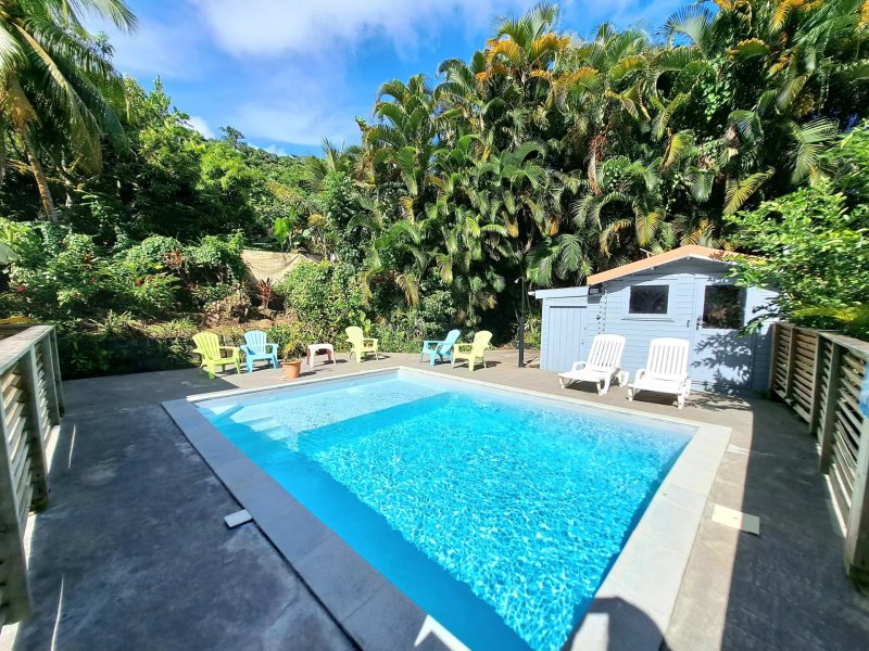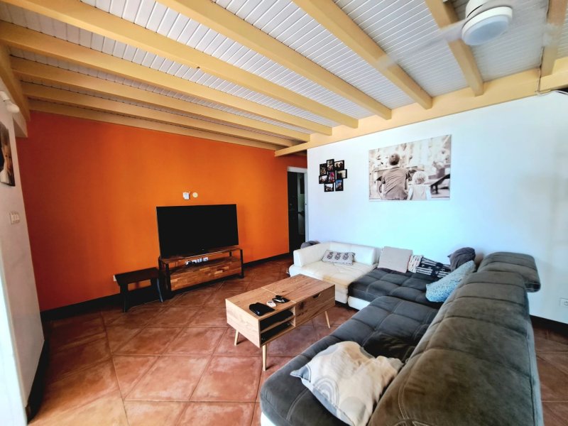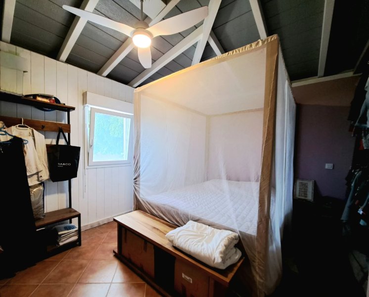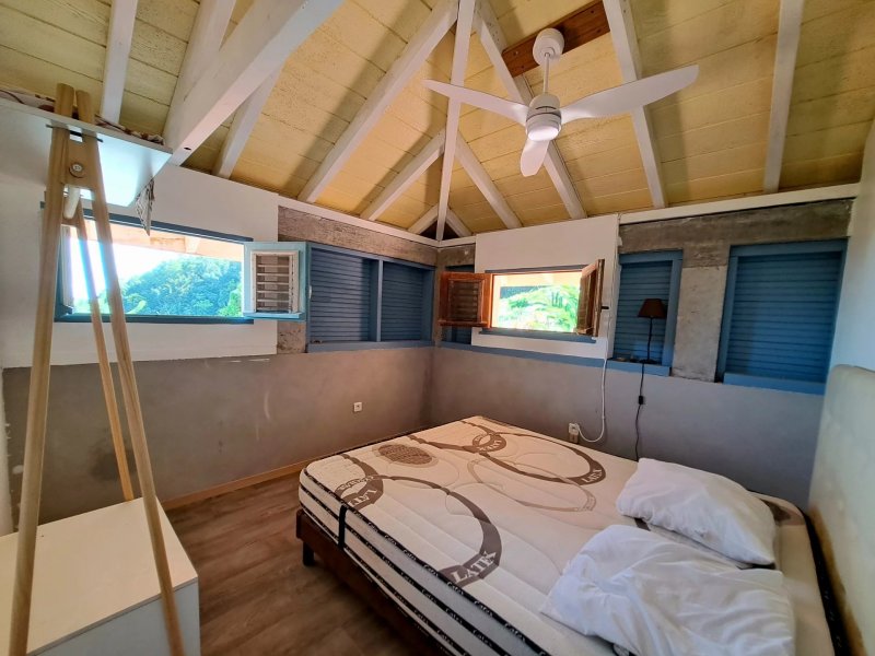 - 1 chambre climatisée, une SDD (dont une avec toilette et l’autre toilette séparé), une cuisine aménagée ouverte sur le salon/salle à manger, une varangue.