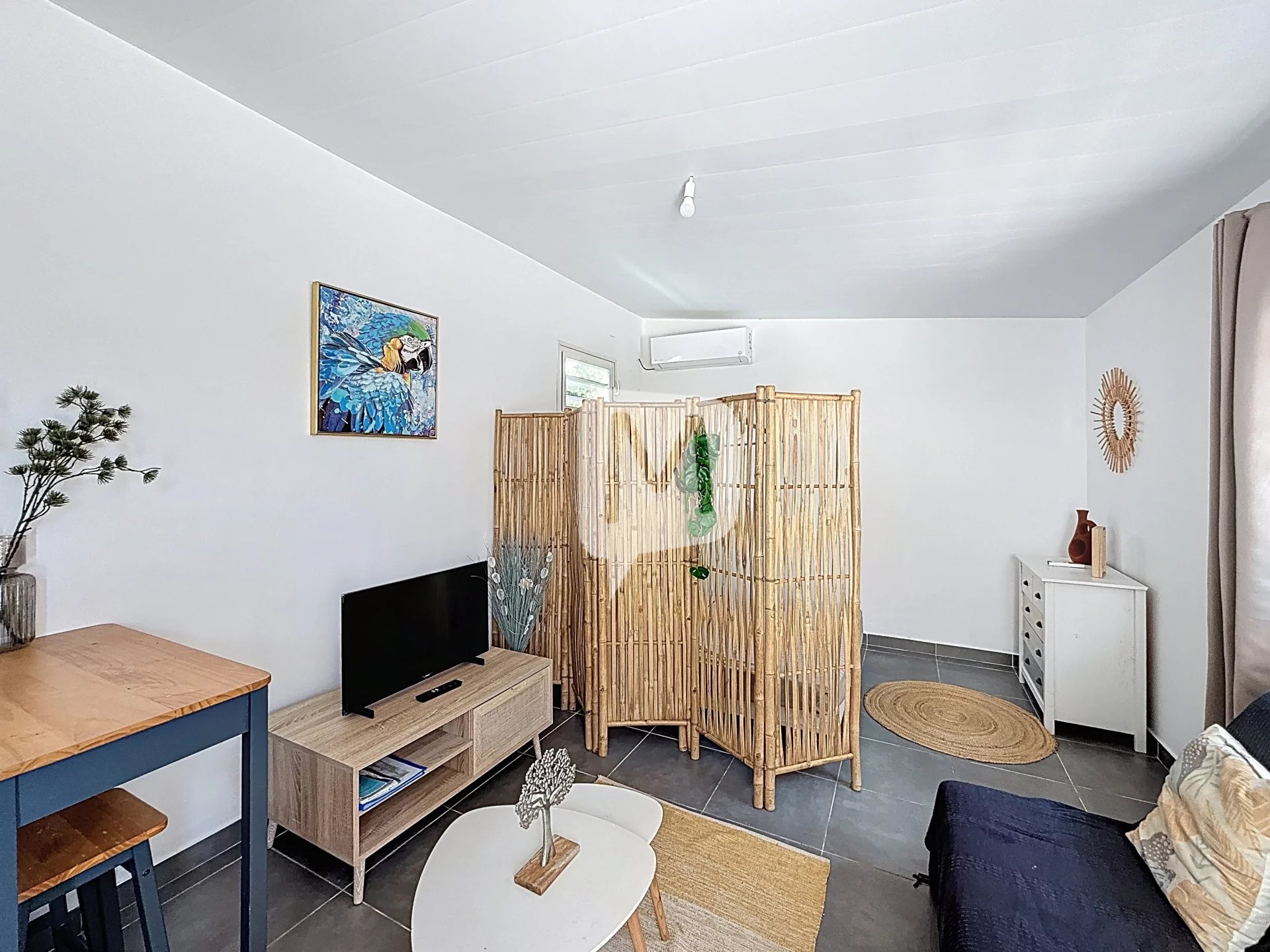 Entrée sur cuisine, cuisine aménagée avec plaque de cuisson, séjour, 1 chambre climatisée,...