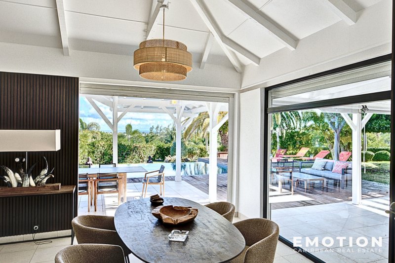Villa d'exception de 300 m2 7 ch + salle de sport à Saint-François ( Guadeloupe) NOUVEAUTE Le cabinet EMOTION Real Estate Guadeloupe, vous propose un nouveau bien à la vente sur les Hauts de Saint-François à deux pas du Golf international et de son lagon. Nichée sur sur un terrain cloturé et arboré de 1 807 m2, cette propriété d'exception séduit par ses volumes, son raffinement et ses prestations haut de gamme. La Villa se compose d'un vaste salon traversant et lumineux de 75 m2 avec plafond cathédrale, une cuisine ouverte de 20 m2 entièrement équipée avec accès au garage, 1 suite d'exception de près de 50 m2 avec dressing intégré, bureau de 17m2, salle d'eau avec 2 douches intérieure et extérieure. Elle s'ouvre à la fois sur la terrasse principale avec piscine et jardin et sur un espace privatif orienté nord. 2 chambres climatisées avec placard de 11 m2 et salles d'eau avec douche à l'italienne de 6 m2 et 10 m2, une chambre enfant de 8 m2. Le bien se compose au 1er étage d'une suite climatisée de 12 m2 avec salle de bain de 14 m2. Directement accessible depuis les terrasses, 2 suites indépendantes climatisées de 18 m2 chacune avec placards et salles d'eau avec douches à l'italienne de 4 et 8 m2. Le bien se compose au niveau inférieur d'une salle de sport équipée de 22 m2 accessible depuis le jardin. La propriété dispose de plusieurs espaces extérieurs ombragés et indépendants permettant de profiter de chaque moment de la journée. La piscine à débordement, le jardin paysager et la vue mer à l'horizon créent un cadre idéal pour la détente et la convivialité. La capacité de 14 couchages est parfaite pour accueilir famille et amis. Elle est actuellement exploitée en location saisonière avec un revenu moyen de 6 000 EUR/semaine selon les saisons. Elle est vendue entièrement meublée. Le bien se compose en annexe : - 2 places de stationnement aérien - 1 portail électrique - 1 piscine au sel à débordement de 10 m de long et 4 m de large - 1 garage 1 voiture avec mezzanine - 3 terrasses en bois Kumarou - Citerne 3 000 l - Groupe électrogène - Toiture vérifiée et entretenue - DPE: C - Taxe Foncière : 3673 EUR - PPRN 2019 : Zone Blanche - Prix : 1 768 000 EUR HAI, les honoraires sont à la charge du vendeur Pour plus d'informations, contactez-moi par téléphone ou Whatsapp Florence Caruso +33 6 73 39 15 48