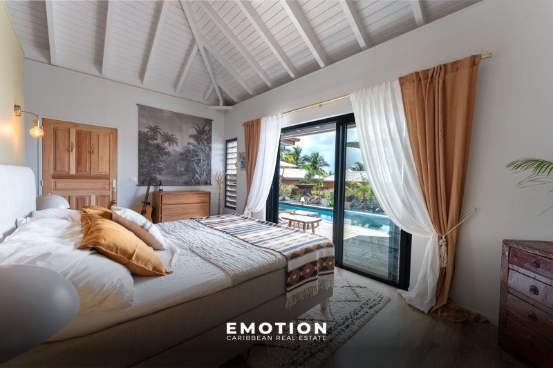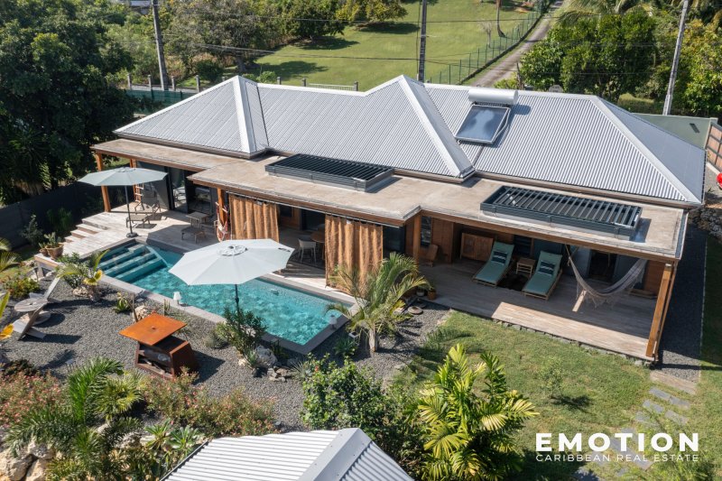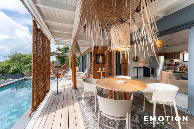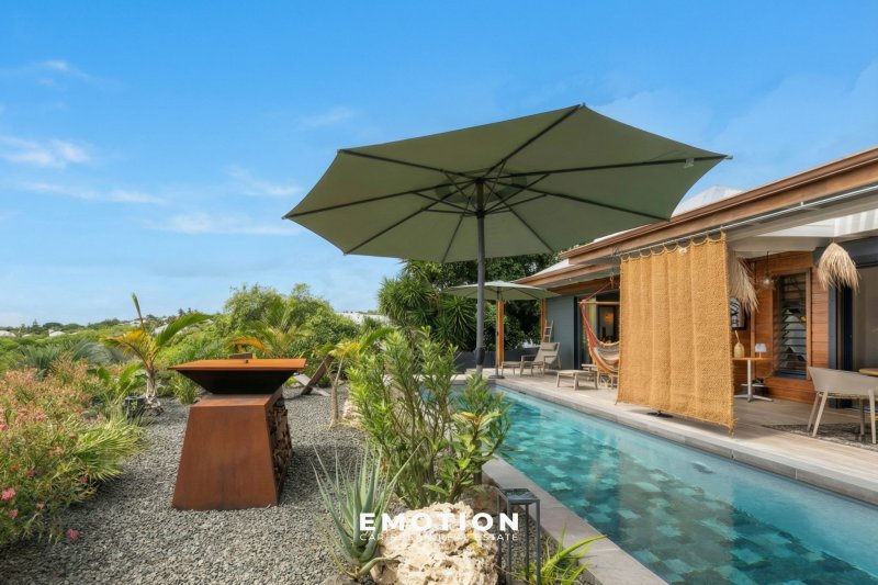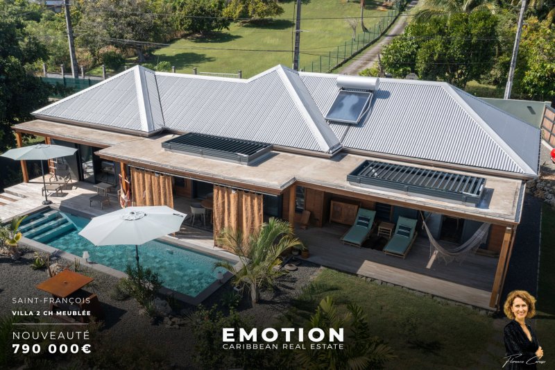Villa T3 entièrement meublée petite vue mer à Saint-François ( Guadeloupe) NOUVEAUTE Le cabinet EMOTION Real Estate Guadeloupe, vous propose un nouveau bien à la vente sur la commune de Saint-françois appréciée en particulier pour son lagon, son aérodrome et son Golf international dans un magnifique jardin tropical clôturé d'environ 800 m2. La Villa de 111 m2 se compose de: un salon lumineux de 46 m2 avec une très belle hauteur sous plafond et sa cuisine entièrement équipée, 2 suites de 33 m2 et 24 m2 climatisées avec chacune salle de bain, douche à l'italienne et dressing. Le salon et les chambres s'ouvrent sur la piscine et la terrasse ombragée de 66 m2 dotée de deux pergolas bioclimatiques. Les finitions sont parfaites et la décoration a été réalisée avec beacoup de goût en mélangeant confort moderne et authenticité. C'est un bien idéal pour y habiter ou pour un investisseur qui recherche une très belle rentabilité financière. La villa construite en 2023 bénéficie des garanties décennales. Le bien se compose en annexe : - un bungalow de 18 m2 abritant 2 citernes d'eau pour un total de 1 500litres , une plonge professionnelle, un frigo à boissons, un congélateur ainsi que divers outils et matériel de jardinage. - 3 places de stationnement aérien - une piscine de 9 m x 2,5 m - PPRN 2019 : Zone Blanche - DPE A - Prix : 790 000 EUR HAI, honoraires à la charge du vendeur Pour plus d'informations , contactez moi par téléphone ou Whatsapp Florence Caruso +33 6 73 39 15 48