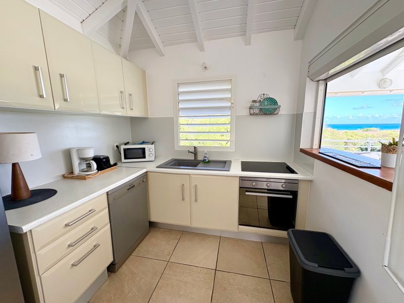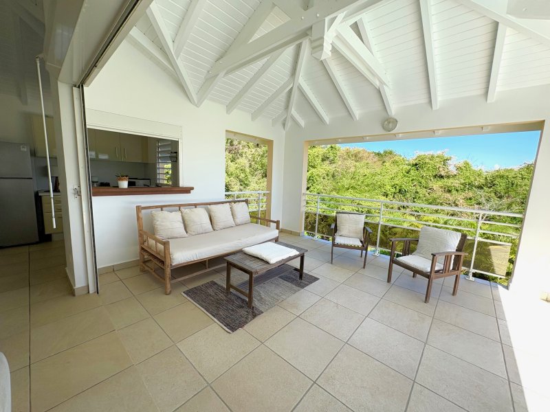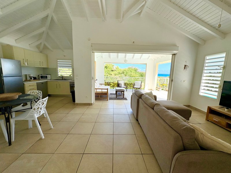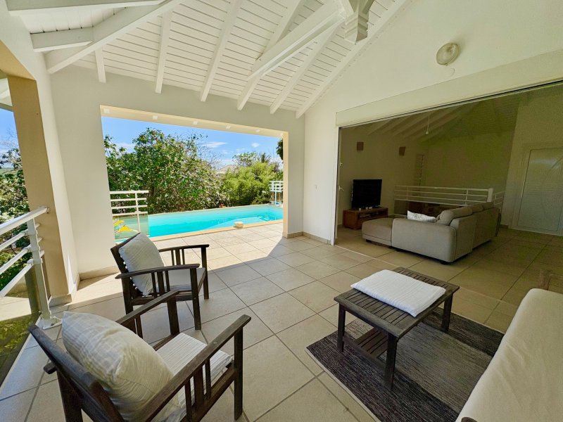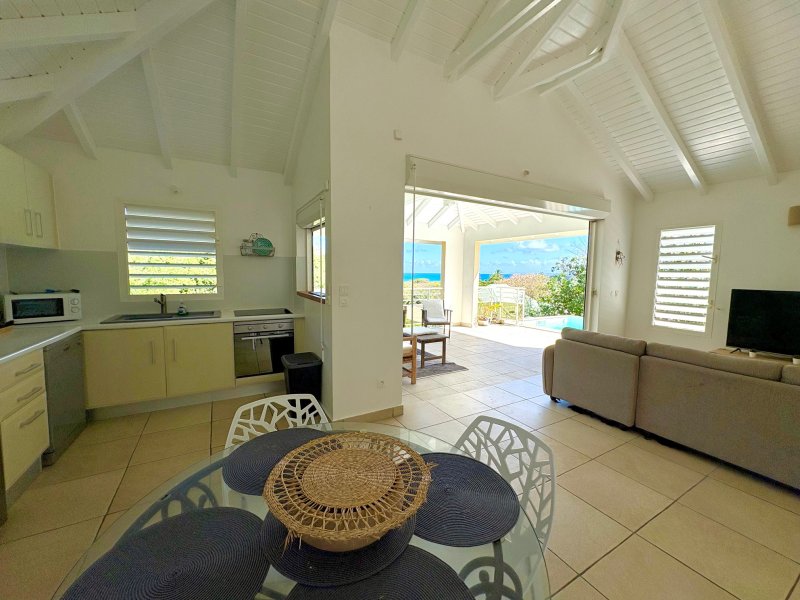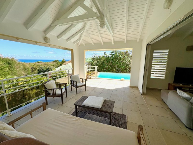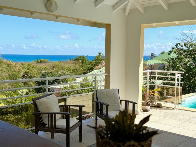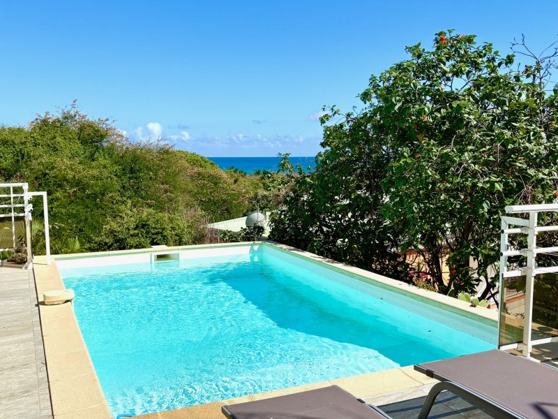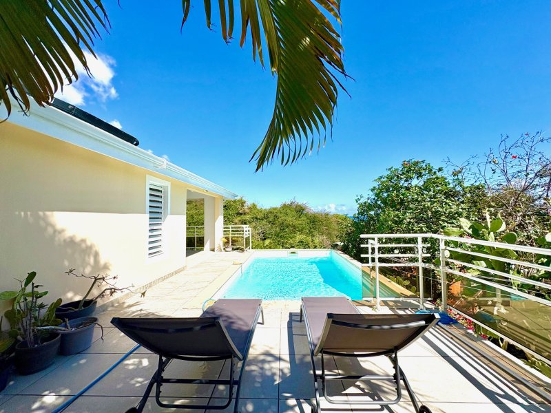 PLEINE VUE MER depuis le salon, la terrasse et la piscine de la villa duplex contemporaine de type F3 de 123 m2 (terrasses comprises) située dans un quartier très recherché et résidentiel proche de la plage accessible à pied. Composée à l'étage d'un vaste salon avec charpente cathédrale, 1 cuisine US équipée avec passe-plat vers la terrasse, 1 salle d'eau/WC 'PMR', 1 terrasse avec vue degagée et vue mer prolongée par 1 plage carrelée et la piscine. Au niveau R-1,un large dégagement dessert les 2 belles chambres climatisées donnant chacune sur 1 galerie ombragée en rez de jardin, 1 salle d'eau, 1 grand WC séparé. Un local technique piscine complété d'un coin buanderie permet de stocker les objets encombrants. Le jardin est clos 670m2 env avec végétation tropicale. Citerne tampon. Parking 2 places mini. Pour plus d'informations contacter Laurence CAILLET par WHATSAPP et SMS au +590 690 002 312 ou par SMS au 0690 35 97 18 et par mail : laurence@immo971.com et/ou cailletlo971@gmail.com en laissant vos coordonnées et l'objet de votre appel.
