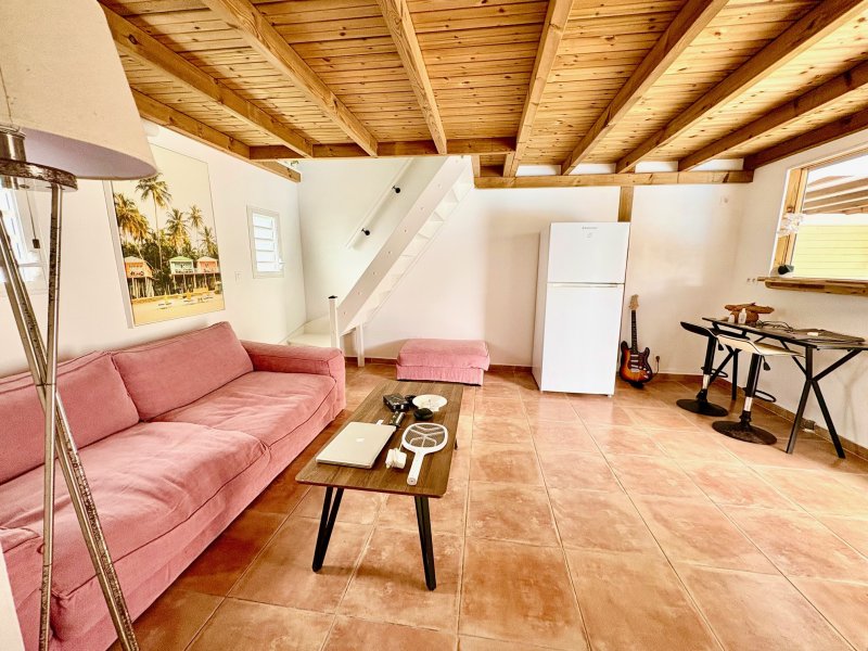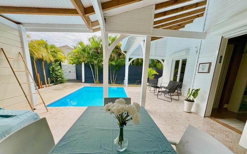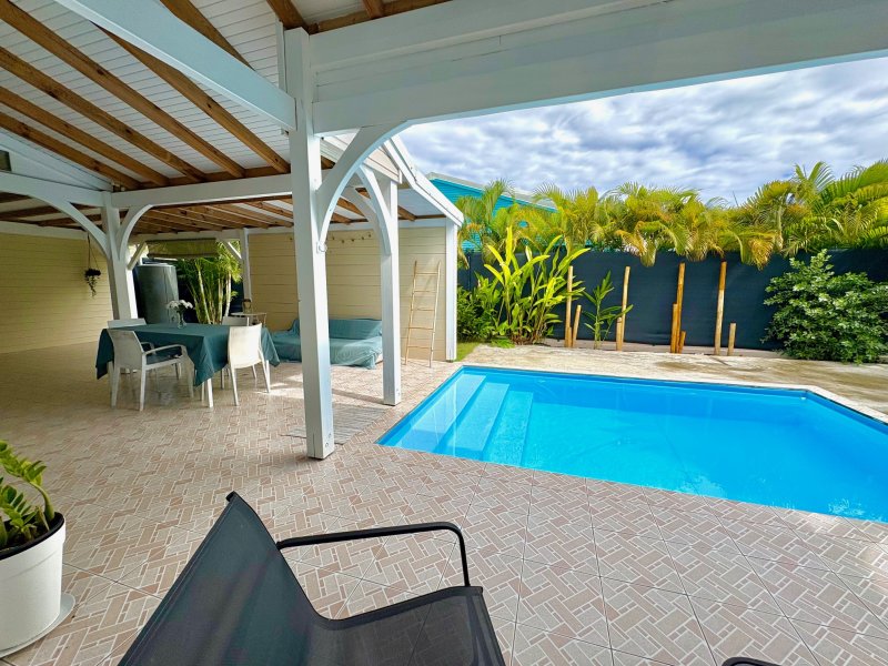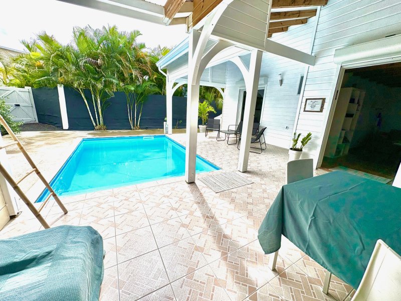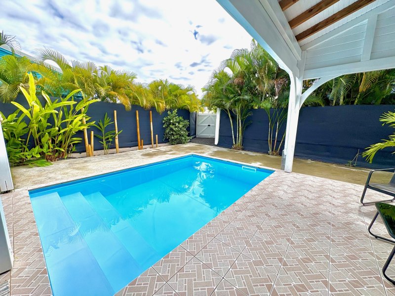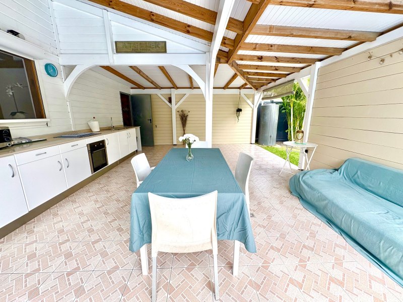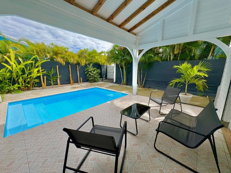 Maison F3/4 meublée et équipée d'une surface totale d'env. 119 m2 (terrasse comprise), nichée dans 1 petit jardin tropical intimiste à seulement 2 km de la plage des Raisins Clairs et du collège. Composée de 1 salon, 2 chambres climatisées avec rangement, 1 salle d'eau, 1 WC séparé, 1 grande terrasse d'env. 55m2 avec cuisine US équipée et agencée, pièce convivale avec son coin repas et son salon extérieur, 1 pièce débarras/buanderie d'env. 16m2, 1 piscine, 1 citerne bac tampon, 1 CE solaire. Jardin clos d'env. 270 m2. Place de parking. Idéal pour un pied à terre en Guadeloupe ou pour revenus locatifs touristiques et/ou longue durée. Pour plus d'informations contacter Laurence CAILLET par WHATSAPP et SMS au +590 690 002 312 ou par SMS au 0690 35 97 18 et par mail : laurence@immo971.com et/ou cailletlo971@gmail.com en laissant vos coordonnées et l'objet de votre appel.