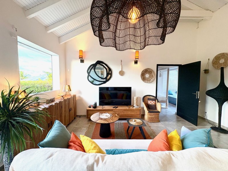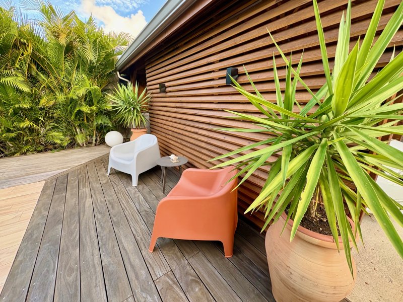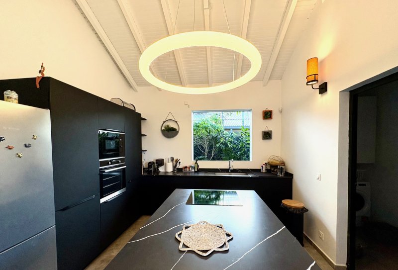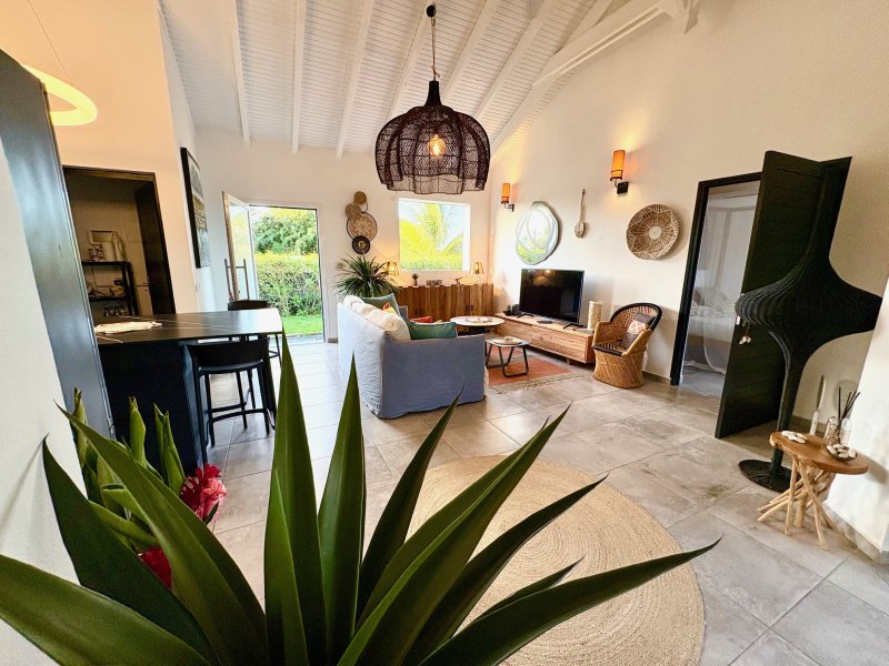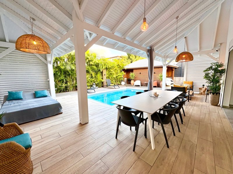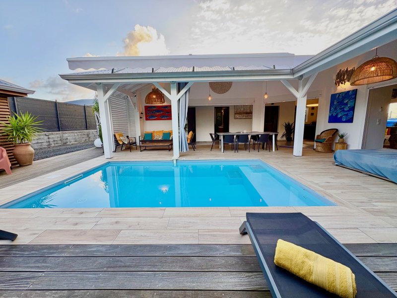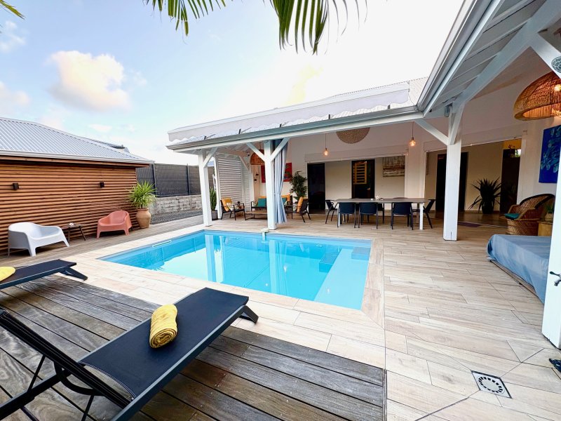Villa F4 intimiste de 130 m2 env. (terrasse comprise), parcelle d'env. 490m2 clos, construction de 2022, sous garantie, de plain-pied, cozy et contemporaine, vendue toute équipée avec meubles et décorations haut de gamme (Clair Ambance entre- autre et linge de maison), aucun rajout à prévoir, fermeture des volets à distance, caméras, alarme, fibre internet, villa soigneusement entretenue, habitable de suite, parfaite pour revenus locatifs touristiques, très recherchée. Parcelle d'env. 490m2 avec piscine chauffée (sel), carport+atelier de 25m2, 2 citernes tampon (2x1500L). Situé dans quartier calme à 8 min. de la Marina et 10 min du lycée. Cuisine moderne avec îlot central, cellier, 1 suite parentale clim.+ salle d'eau/WC, grande terrase d'env. 40m2 avec salle-à-manger, 2 chambres clim. avec placard, 1 seconde salle d'eau/WC, plage carrelée autour de la piscine, store électrique, moustiquaires, espaces verts faciles d'entretien.Pour plus d'informations contacter Laurence CAILLET par WHATSAPP et SMS au +590 690 002 312 ou par SMS au 0690 35 97 18 et par mail : laurence@immo971.com et/ou cailletlo971@gmail.com en laissant vos coordonnées et l'objet de votre appel.