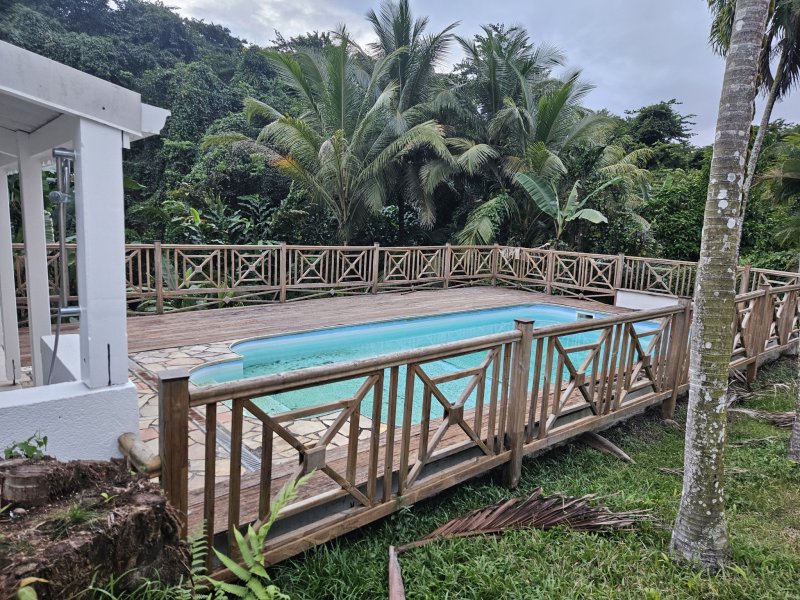 Villa F6 avec piscine dans un lotissement à BAIE-MAHAULT. Villa de 160 m2 sur 1006 m2 de terrain clos et arboré. Elle comprend : r - RDC : 1 bureau climaisé 3 chambres climatisées , 2 salles d'eau, wc, 1 piscine + 1 carbet avec sa cuisine. , 1 chambre indépendante. - A l'étage : 1 cuisine américaine aménagée et équipée, 1 séjour avec mezzanine, 2 chambres climatisées, 2 salles d'eau, 1 salon, 1 grande terrasse en L.